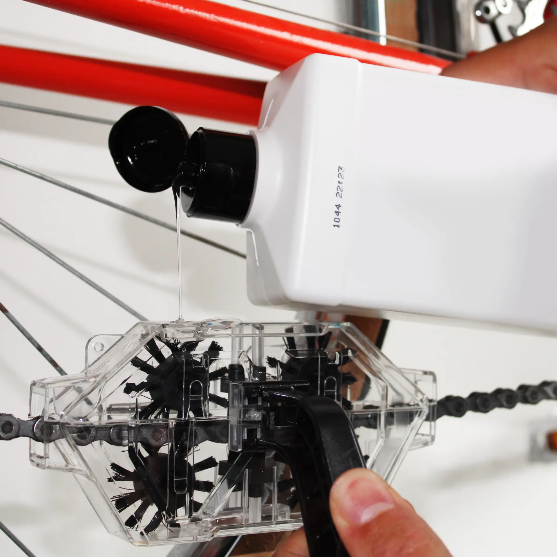 • Herhaal het proces van kettingreiniger installeren en de ketting erdoorheen laten lopen tot de ketting grondig is gespoeld.