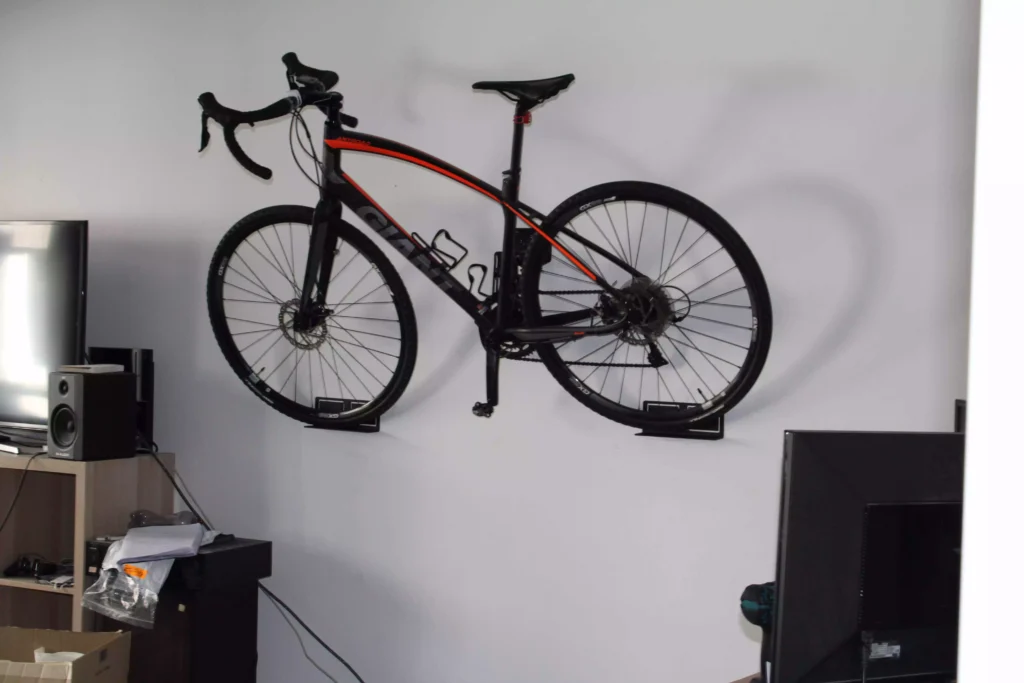 De fiets hangt aan het pedaal onder een hoek, ondersteund door twee solide Wieldragers. Bij een niet verschuifbaar systeem komen de fietsen verder van de muur te hangen, om zo alle type fietsen te accommoderen. Bij ons kan met een simpele draai aan de vleugelmoeren het systeem zich aanpassen op de grootte van het pedaal, waardoor elke fiets zo dicht mogelijk tegen de muur hangt. Dit zorgt voor een optimale ruimtebesparing, ideaal voor de krappe gang of garage.